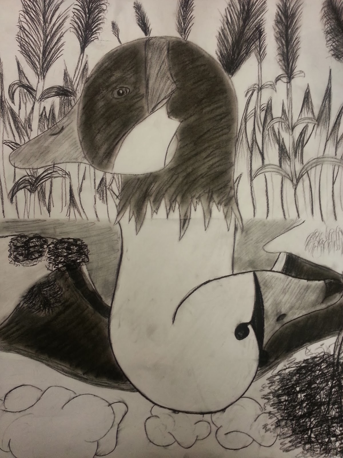 By the time I was finished, I was pretty proud. The shape of the goose and swan's head was in perfect shape and the background was pretty good. I think the best part about my project is the birds itself. I really like how the shape of it just kind of went exactly how I wanted it to be and how the beaks differ from the goose and the swan. I'm not completely proud of the way the background of the birds were drawn, but I did my best and it's good enough for me. Plus, my art teacher loved the way it turned out so, that's pretty amazing too! Anyway, I would probably change the way I drew the bridge behind the swan because I didn't really put that much detail into it and I really wish I had. The final outcome:Yet again, the swan's neck was merged with the goose's neck to create an abnormal look, but that's what my favorite part is. I just like the way I drew the fur going into each other. I put the grey goose fur on top because they are what you're prone to see when you go to a lake or pond. I drew in a bridge and a tree (a New York look) because when you think of a swan, you think pretty, romantic things. The first thing I thought of was Central Park of New York. I put in a thicket of grass behind the goose because that's what they eat and that's where you're most likely going to be seeing him. That's basically how my piece of art came to be!